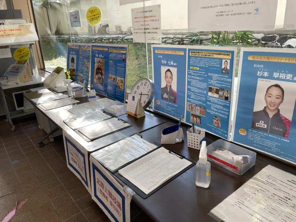 まずは受付前に入り口そばにある受付表に利用者ナンバーと体温を記入します。
