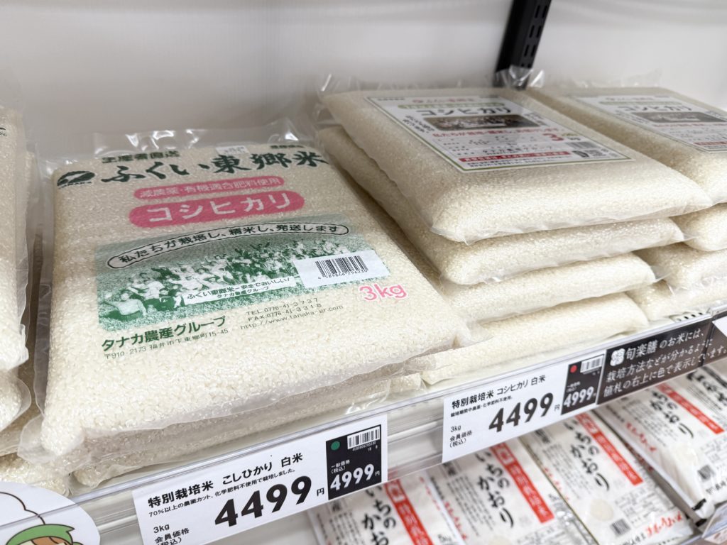 2025年8月6日時点では、令和6年度産「特別栽培米こしひかり(福井県産)」3 kgで会員価格4,499円でした。(会員でない場合は、4,999円です。)1kg換算だと、およそ1,500円です。
