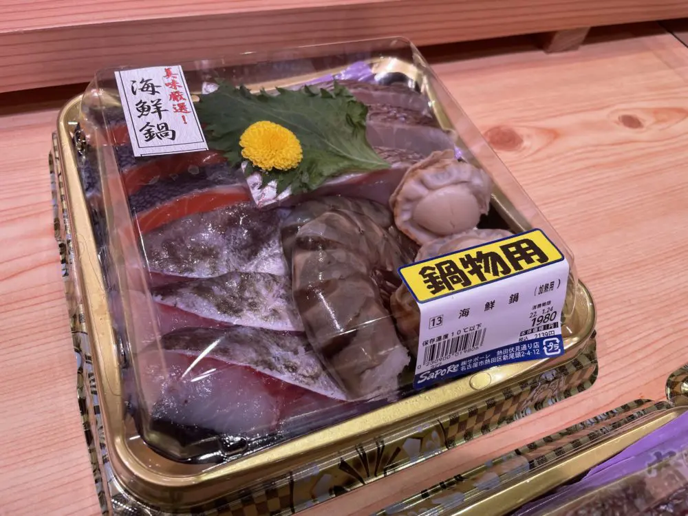 鮭、たら、真鯛、海老、ホタテが3つずつ入った海鮮鍋。