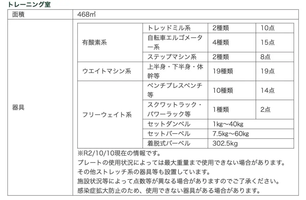 トレッドミルやバイクなど一通りあります。他のジムと比べてトレッドミルの数が多く感じました。設備も比較的新しいです。コロナ対策としてパーテーションで隣と区切ってあります。