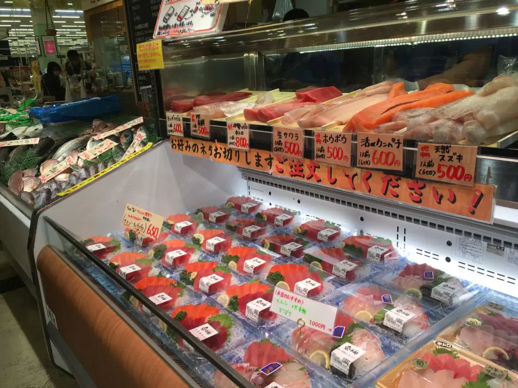 切りたてのお刺身のほうが断然美味しいです。その日によって陳列されているものが変わります。