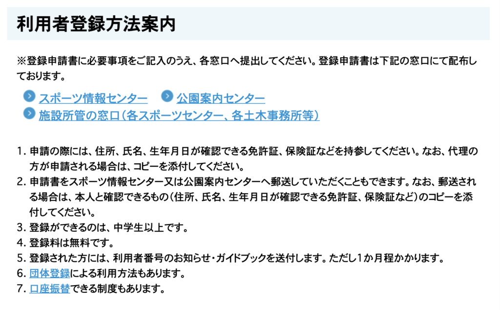 3、施設所管の窓口(土木事務所または各スポーツセンター)最寄りの施設でどうぞ